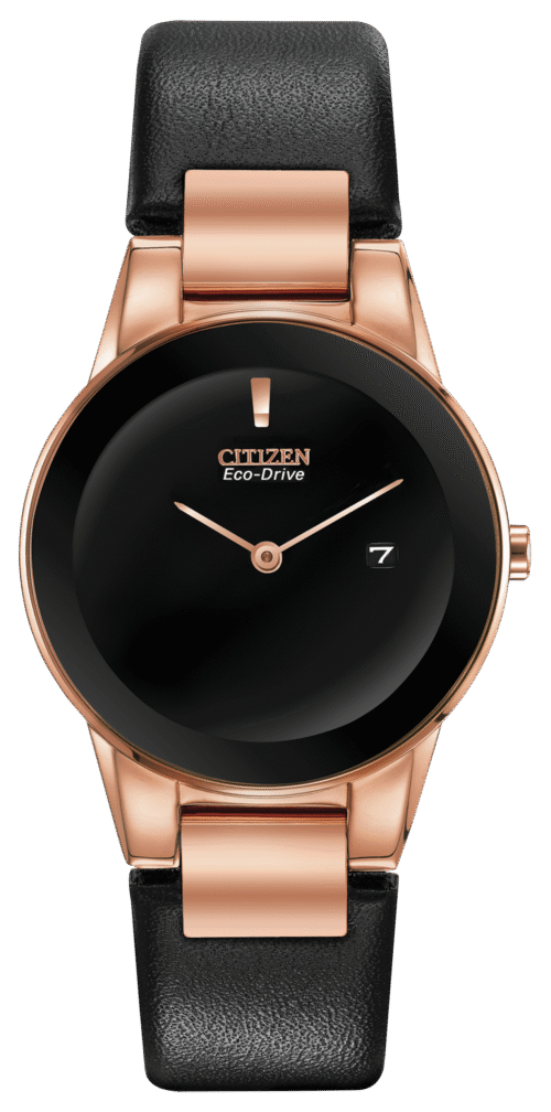 Axiom’s refined yet sleek design offers a day-to-night fashion options for the avid trendsetter. A watch with CITIZEN’s Eco-Drive technology, not just a solar watch, but powered by any light, featured in a ladies’ rose gold-tone stainless steel case, black leather strap with black dial and the intriguing feature of edge-to-edge glass. Caliber number J165.