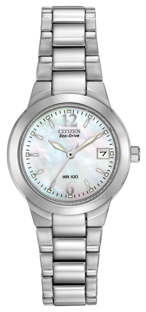 The surprise of a mother-of-pearl dial lends this ladies’ sport watch a extra feminine touch. Ever practical, this stainless steel 3-hand model with 26mm case also features luminous hour and minute hands, a date indicator, foldover clasp with push-button, and 100 meter water resistance. Featuring our Eco-Drive technology – powered by light, any light. Never needs a battery. Caliber number E011.