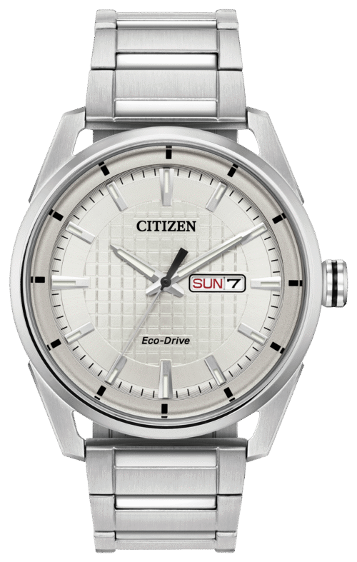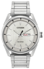 The Drive from CITIZEN CTO collection. A collection of watches with classically modern design. Featured here in a stainless steel with silver-tone dial and day/date. Featuring our Eco-Drive technology – powered by light, any light. Never needs a battery. Caliber number J800.