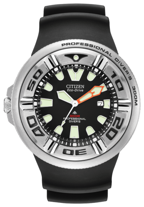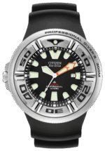 Citizen Eco-Drive Promaster Professional Diver is used for mixed gas diving with its 6mm non-reflective curved crystal, ratcheted elapsed-time bezel, screw-back case & screw-down crown, and reinforced urethane band and extender, with a carrying case for the wetsuit strap extension. Crafted in stainless steel with luminous accents, and 300M WR. Featuring our Eco-Drive technology – powered by light, any light. Never needs a battery. Caliber number B873.