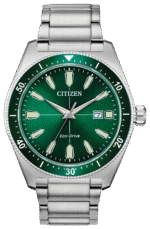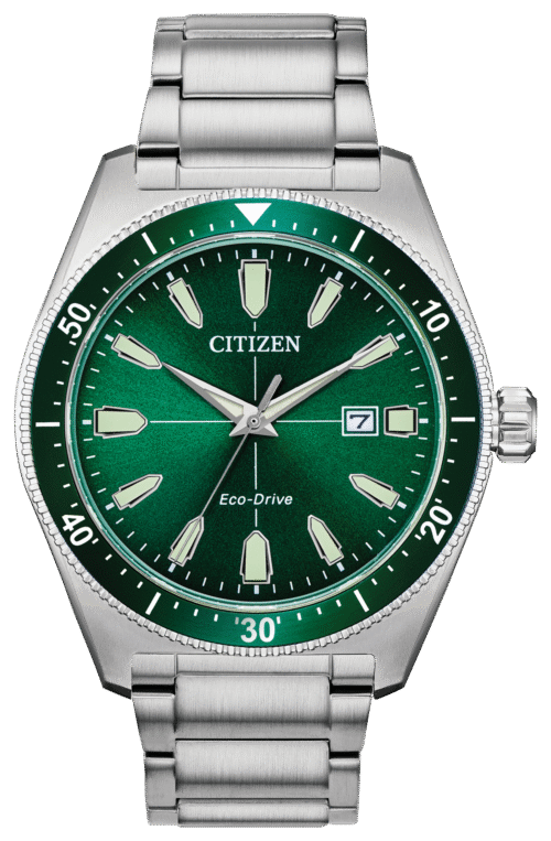 Nothing says classic better than a vintage throwback, and the redesigned Citizen Vintage Brycen Sport timepiece is just that, with distinguished features sure to stand out on your wrist. This stylish watch in a stainless steel case with pine green dial and bezel, stainless steel bracelet and date. Featuring our Eco-Drive technology – powered by light, any light. Never needs a battery. Caliber number J810.